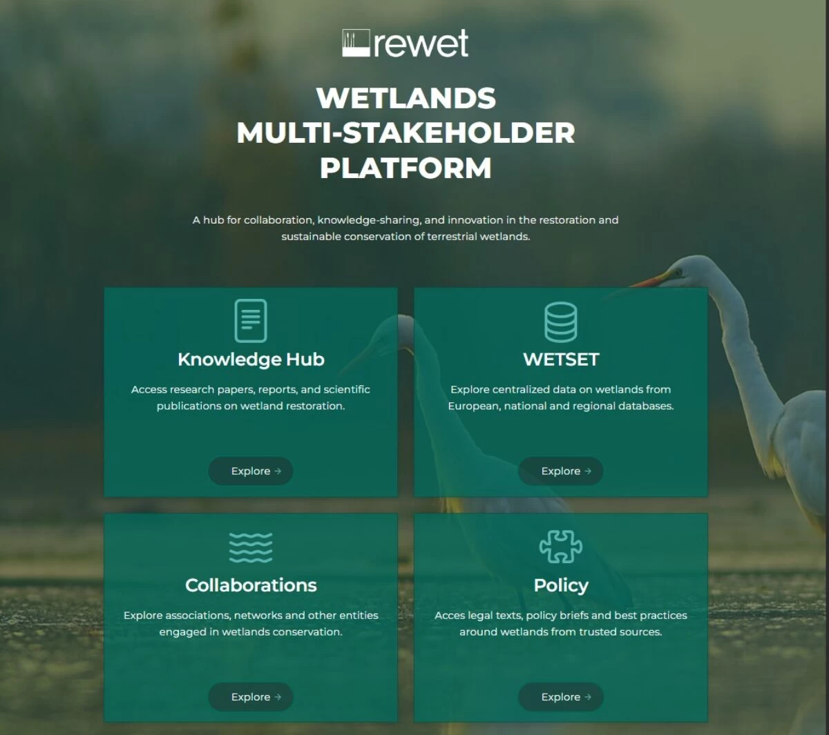 The Wetlands Multi-Stakeholder Platform developed by the Horizon REWET project is a collaborative digital space dedicated to advancing wetland restoration and sustainable conservation in Europe. Currently, the platform functions as a structured database offering access to research, open data, and policy-relevant texts supporting the restoration of wetlands in Europe.